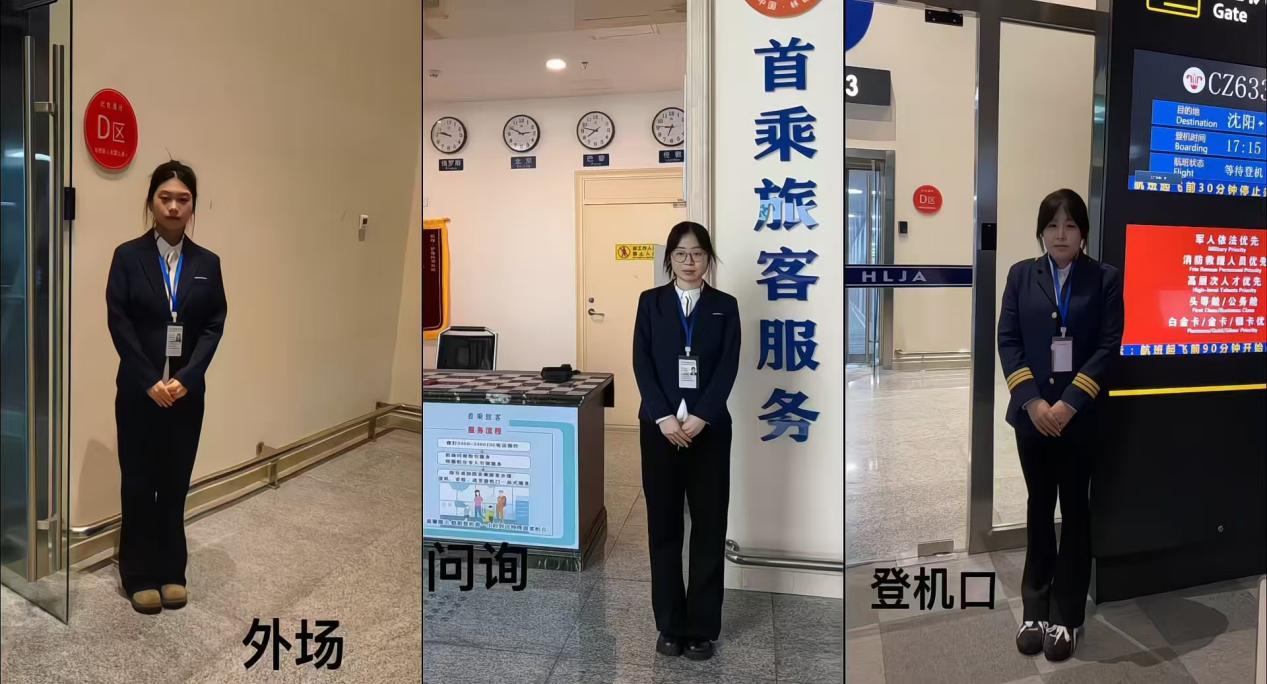 抵达机场后,学子们经过一周岗前培训快速上手。在问询处,她们笑容热情,细心解答旅客疑问,赢得旅客称赞;在值机柜台,她们仔细核对信息、协助办理手续、引导行李托运,确保工作顺利开展;在旅客引导岗位,她们举牌迎接,引导交通,协助行动不便者搬运行李,以实际行动践行 “服务至上” 理念;在安检岗位,她们严格遵循流程,认真检查行李与人员,不放过任何隐患,保障安检工作有序进行。