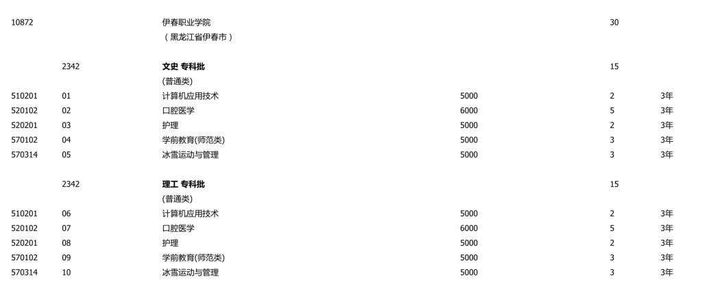 伊春职业学院2023年吉林省招生计划