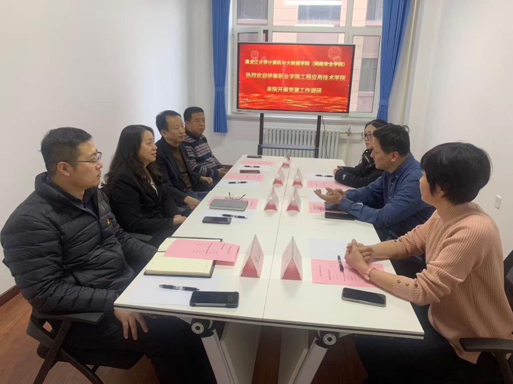 为深化党建引领作用,拓宽党建工作思路,提升支部建设水平,1月6日,工程应用技术学院党支部赴黑龙江大学,与计算机与大数据学院(网络安全学院)党委开展党建工作交流活动。会议由黑龙江大学计算机与大数据学院党委书记姜晶玲主持,学院党委副书记张立才、教工第二党支部书记金虎、教工第一党支部书记马吉权出席会议。