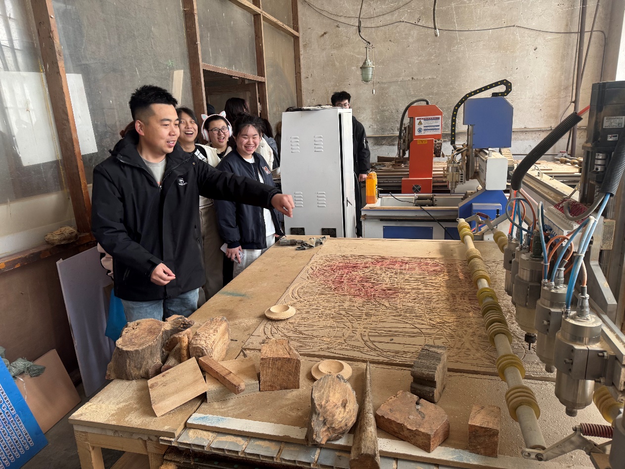 随后,学生们前往加工生产车间,学习了解木艺生产流程。车间内秩序井然,工匠们熟练操作各类设备,完成木材处理、切割、打磨等工序,让学生直观认识到木艺生产的科学性与规范性,深刻体会“细节决定成败”的专业真谛。