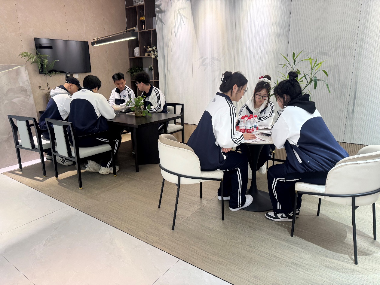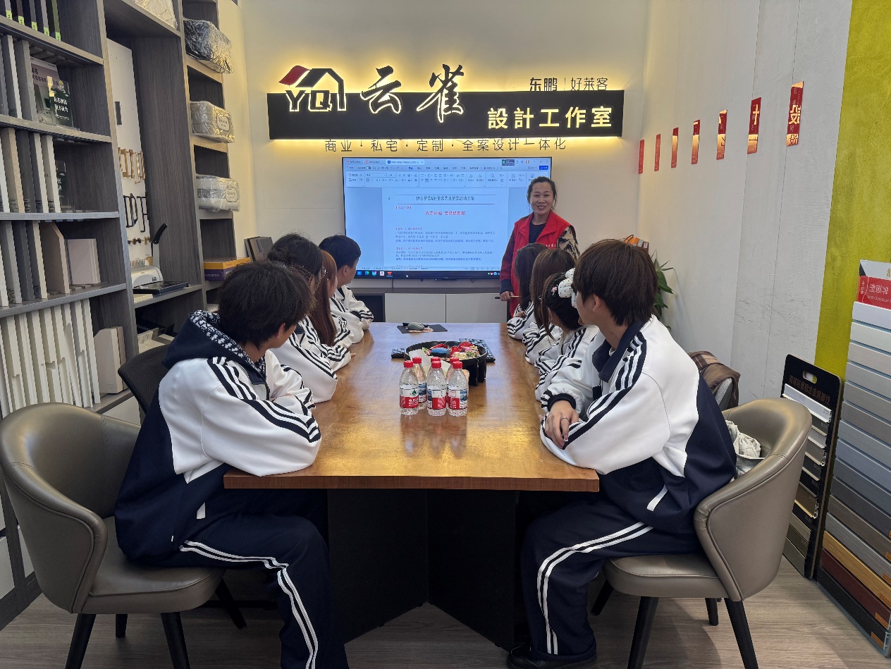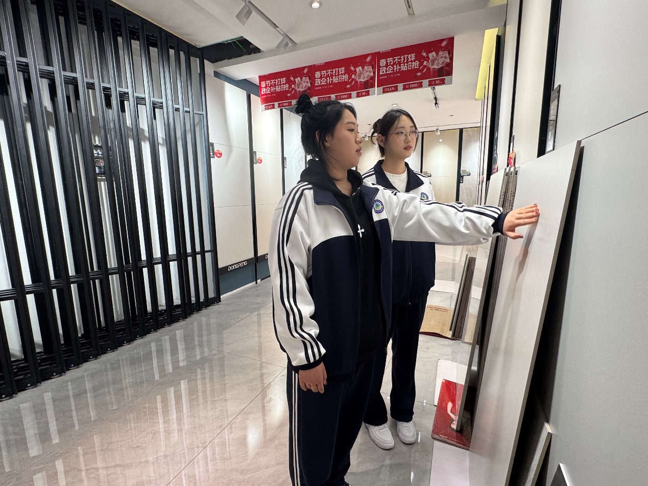 见习伊始,云雀装饰首席设计师热情接待了师生一行,结合实际案例,系统讲解了室内装修的核心知识。从空间布局规划、色彩搭配原则到瓷砖等装修材料的种类、特性及选购技巧,设计师用通俗的语言拆解专业难点,重点介绍了新型环保瓷砖的防滑、耐磨优势及不同风格场景的适配方法,提升了同学们对装修材料的认知。