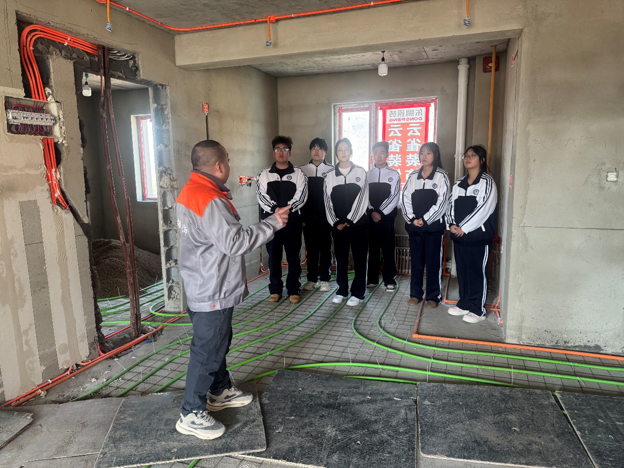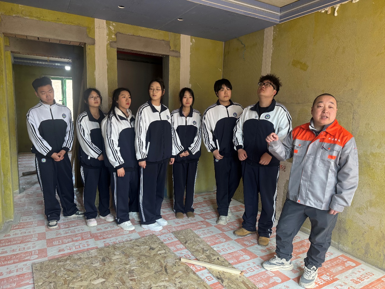 理论学习结束后,师生前往公司在建工地现场,开展实地观摩学习。在工地负责人的带领下,同学们重点学习了水电施工工艺,了解到水电管线“横平竖直”的规范要求、强弱电分离的施工标准及关键流程。同时,工地师傅现场演示了吊顶龙骨安装、柜体制作的基础工艺,讲解了木材选材、拼接技巧及防火防潮处理方法,让同学们直观感受施工细节与专业严谨性。