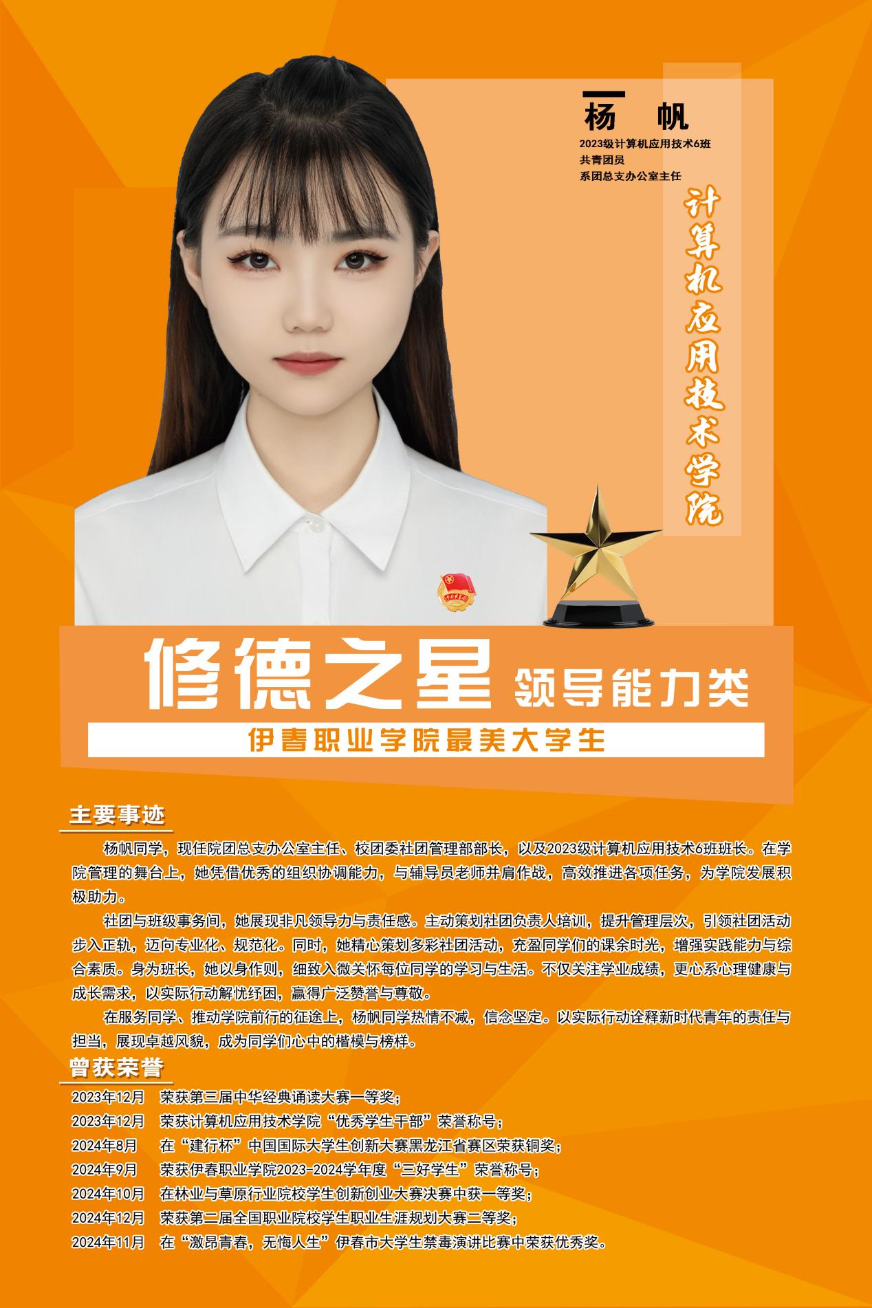 伊春职业学院的“最美大学生”评选活动已圆满落幕,共有14位青春榜样荣获此项殊荣。他们以实际行动谱写出动人的青春乐章,为校园生活注入了蓬勃的正能量,成为同学们竞相学习的楷模。让我们携手走进伊职,探寻“最美大学生”的风采,感受他们不懈奋斗、勇于追梦的青春活力。在他们的引领下,让我们一同向“更好”迈进,以“最好”为目标,持续努力,追求卓越。让青春在奋斗中绽放出璀璨的光彩,让梦想在伊春职业学院这片热土上生根发芽,绽放出最为绚烂的花朵。倾听他们扣人心弦的故事,共同见证他们以青春为笔,书写出精彩的人生篇章。