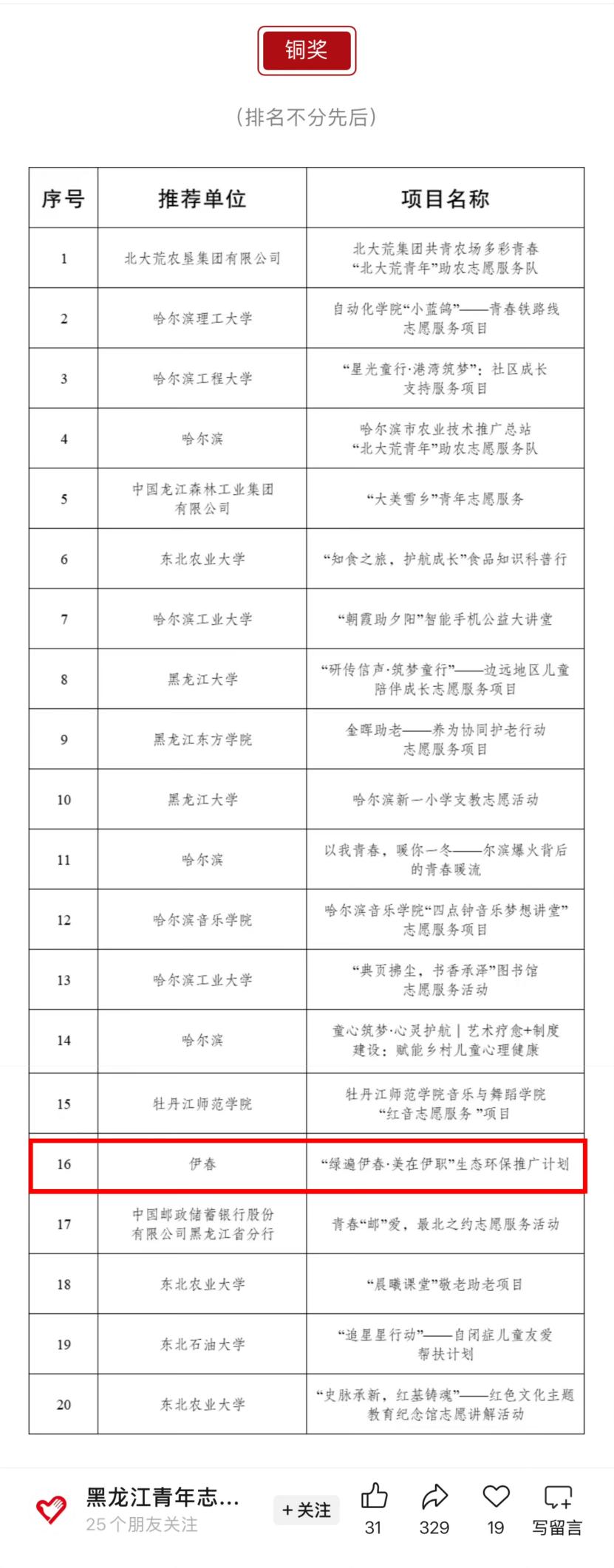 由共青团黑龙江省委、黑龙江省青年志愿者协会主办的第八届黑龙江省青年志愿服务项目大赛暨2025年志愿服务交流会在哈尔滨举办。我校“绿遍伊春 美在伊职”生态环保推广计划志愿服务项目从70个入围终评项目中脱颖而出,斩获铜奖。本次大赛经路演答辩、专家评审等环节层层筛选,最终评选出金奖10项、银奖15项、铜奖20项、优秀奖25项,我校项目的获奖,充分体现了志愿服务项目的专业设计与实践价值。