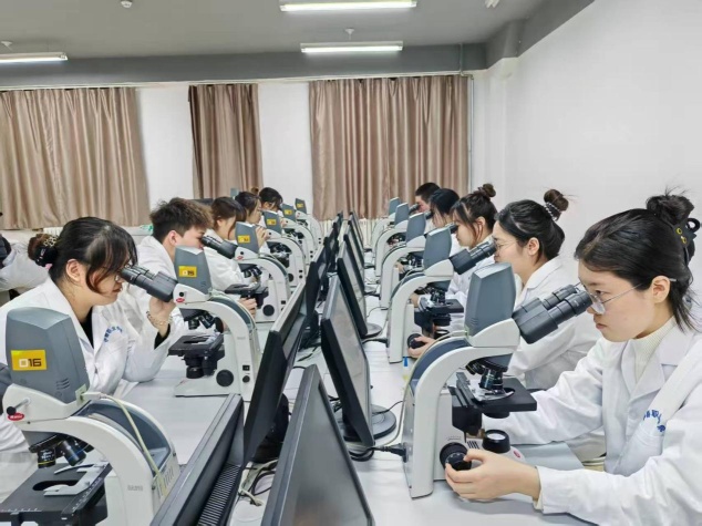 设有生化检验实训室、微生物检验实训室、临床检验基础实训室、免疫学检验实训室等,配置显微镜、分光光度计、半自动化生化分析仪、尿液分析仪、离心机、培养箱、多媒体教学系统等专业的教学仪器设备。2025年新建虚拟仿真实训室,依托虚拟仿真平台构建沉浸式课堂,让学生在三维建模中淬炼检验技能,血液分析、生化检测、微生物检测等核心技能通过全息投影真实再现。
