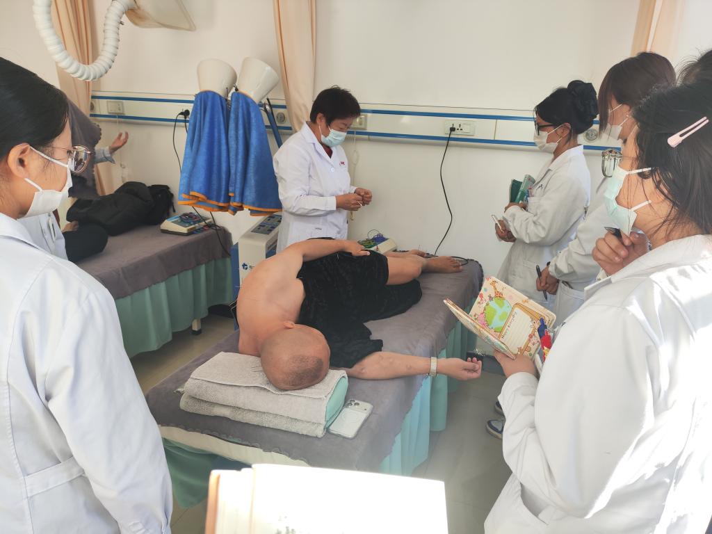现场,复视患者接受四白、风池穴针刺,四白穴可改善脑供血、调理眼疾,配风池穴疗效更佳;两位脑梗患者采用“针康结合”方案:轻症患者经两疗程治疗已行动如常,重症患者老吕因脑血管神经受压致动作迟钝、流涎,医生点刺金津玉液穴止涎,主刺腰腿部穴位并兼顾膀胱经、肾经,针对其新增的呃逆、小便不利,医生以中脘为中心围刺,取关元穴施治,配合腹部烤灯,康复训练时头顶与手臂毫针留针助力恢复;面瘫患者的恢复尤为显著,医生通过抬眉、鼓腮等动作评估疗效,采用阳白透攒竹等透刺手法,辅以四白、鱼腰等穴,电针治疗时精准调参,患者前一日尚无法闭眼,经一次治疗便明显好转;学生们还观摩了艾灸操作,聆听老师解析寒气入里修车师傅的病例,深化了对经络辨证的理解。