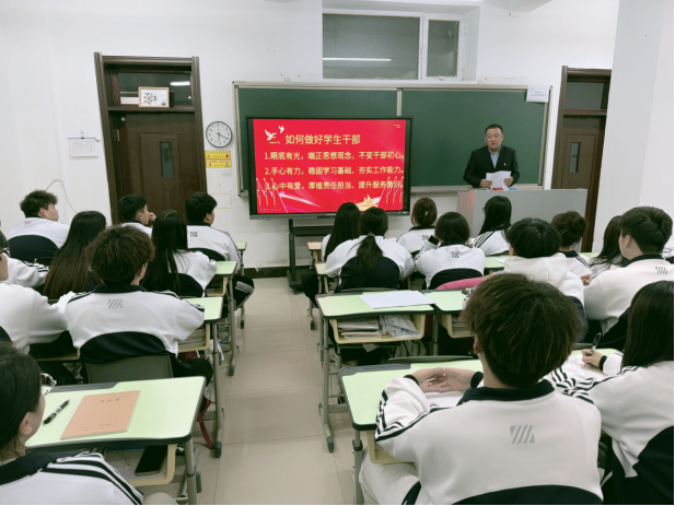 院党支部书记孙晓会代表学院进行了发言。首先,他对学生会干部换届以来工作表示充分肯定,对学生干部们在交流中提出的部分问题进行了回应。他强调,学生会干部是推进学院高质量发展的重要力量,是学生的代言人,既承担着组织者、协调者的角色,又承担着服务者、奉献者的角色,需要不断传播正能量,在促进全院学生学业发展、身心健康、权益维护中发挥着重要作用。随后,他以“如何做一名优秀学生干部”为主题对全体学生干部进行培训。