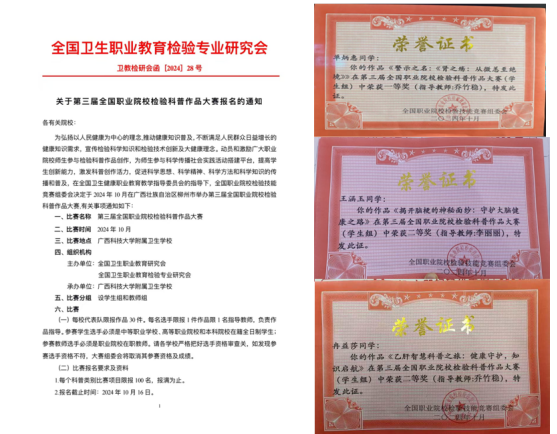 2024年10月,经过专业教师的精心指导和严格选拔,2023级医学检验技术专业的四名学生参加第三届全国职业院校科普大赛,最终获得一等奖一名、二等奖两名的优异成绩。这一成就不仅彰显了学生们的卓越才能,也直接反映了学院高质量教育水平,有效提升了声誉与影响力。