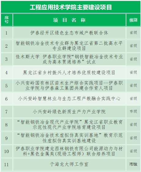 学院的钢铁智能冶金技术、智能轧钢技术为黑龙江省重点建设专业,与机电一体化专业一起构成了“智能钢铁冶金专业群”,是黑龙江省第二批高水平专业群建设项目,正在申报黑龙江省第三批高水平专业群建设项目。林业技术专业与森林和草原资源保护专业为伊春职业学院与伊春森工集团人才“委托培养”建设专业,自2009年至今已经为伊春地区经济发展培养定向人才500余人,目前以上人才均为伊春林业部门骨干力量。森林草原防火技术专业为地方特色专业,“林区大事、防火第一”,这个专业的为地方生态保护提供充足的人才保障。汽车制造与试验技术专业和智能网联汽车技术专业在建设过程中,引入“现代学徒制”人才培养模式,与企业共建了“校中厂、厂中校”的人才培养方式,培养的人才实践能力突出,深受企业欢迎。