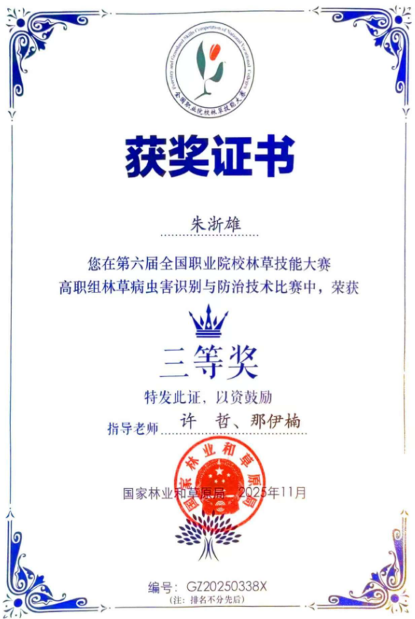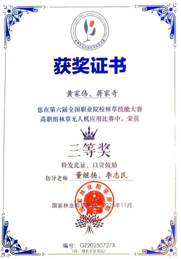 校领导对此次大赛高度重视,将其作为检验教学成果、锤炼学生技能、深化产教融合的重要契机。赛前,工程应用技术学院精心部署备战工作,从选手选拔、师资配备到训练方案制定均进行了系统规划。此次我校共选派3支代表队,分别征战碳汇调查技术、林草病虫害识别与防治、林草无人机应用技术三个赛项。最终,2024级林业技术学生朱浙雄获得林草病虫害识别与防治技术三等奖,2024级林业技术学生黄家伟和蒋家奇获得林草无人机应用技术三等奖。