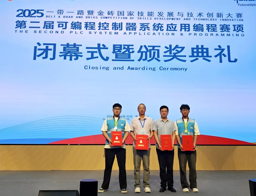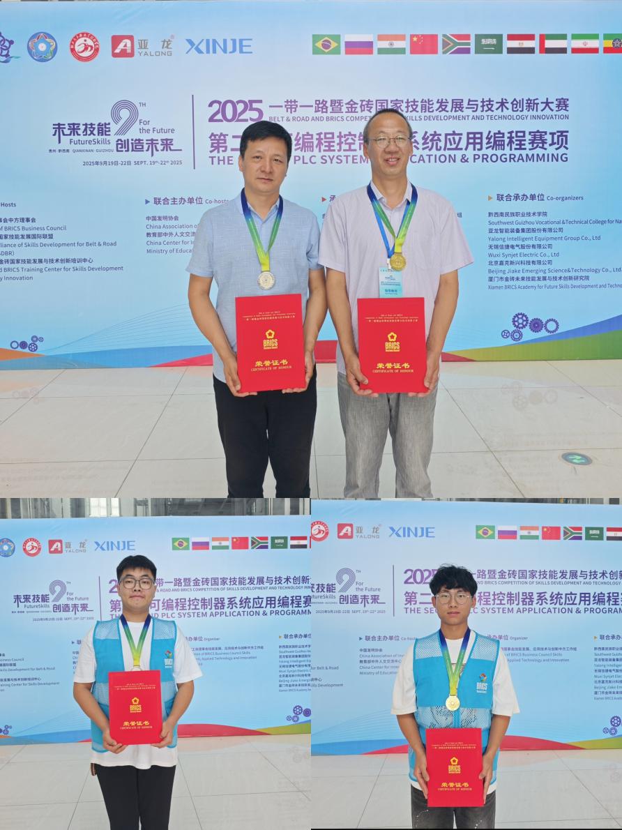 近日,2025“一带一路”暨金砖国家技能发展与技术创新大赛第二届可编程控制器系统应用编程赛项在黔西南民族职业学院举行。我院选派的两组选手分获一等奖和二等奖。