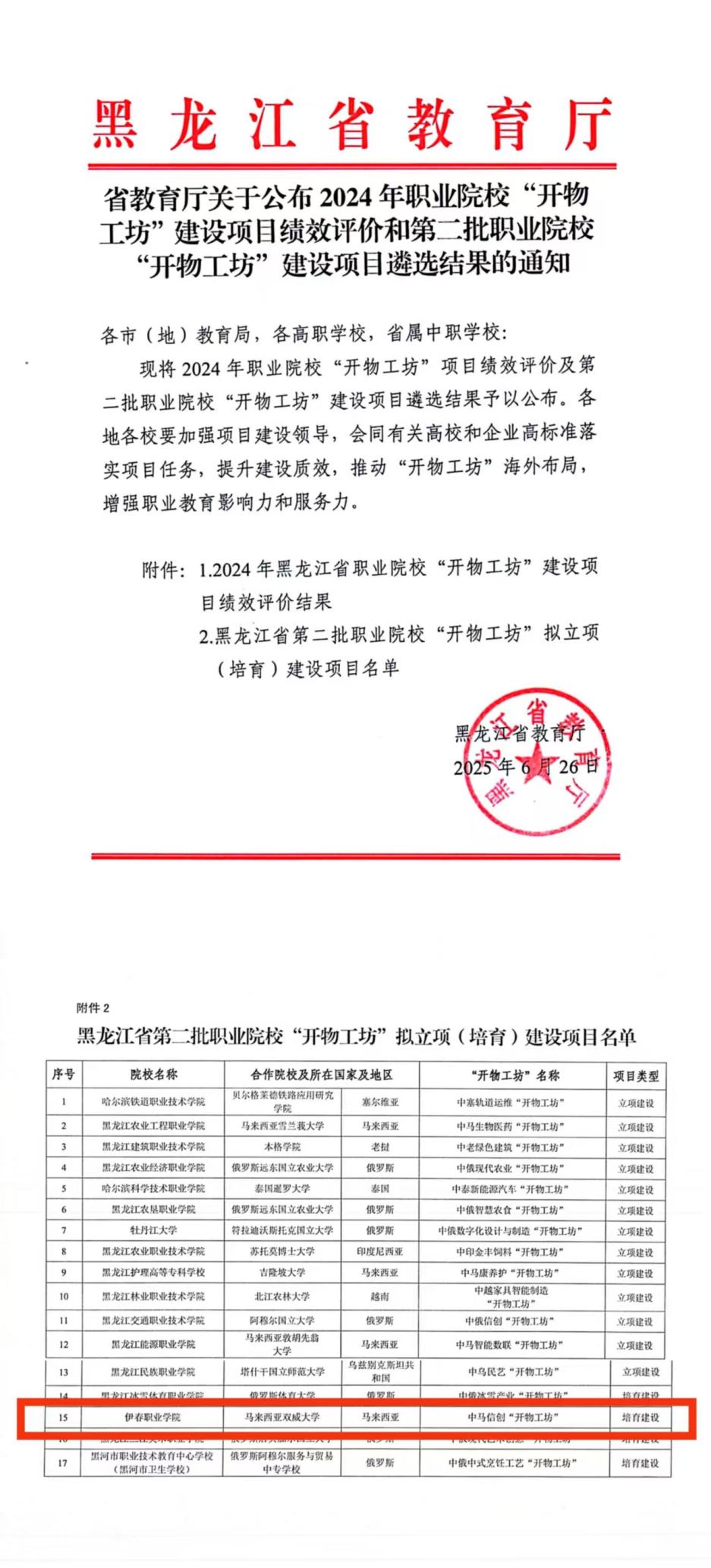 近日,黑龙江省教育厅公布了2024年职业院校“开物工坊”建设项目绩效评价和第二批职业院校“开物工坊”建设项目遴选结果,伊春职业学院计算机应用技术学院成功获黑龙江省第二批职业院校“开物工坊”拟立项(培育)建设项目。此项目是伊春职业学院与马来西亚双威大学合作开展,标志着学院在国际合作办学与职业教育创新发展上迈出了重要一步,同时填补了学校在职教出海领域的空白。
