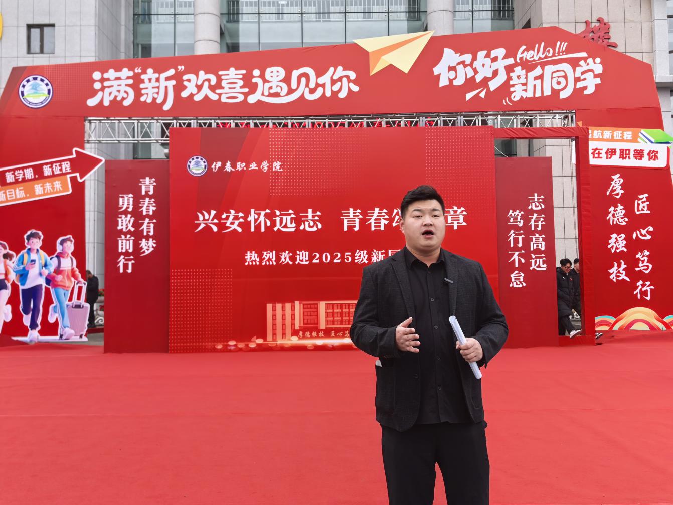电子商务专业教师在现场开启直播,通过镜头带领线上家长“云观”迎新现场,并同步展示校园环境与专业特色,让无法亲临现场的新生家长沉浸式体验迎新氛围。