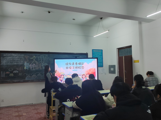 辅导员、班主任深入班级,积极倡导立德修身,围绕“文明学生、创文明班级、明礼课堂、清风寝室、尚俭食堂、清朗网络”几个方面宣讲,教育引导学生积极响应号召,树立文明意识,规范文明礼仪,做到文明出行,养成良好的学习生活习惯,时刻规范自身思想行为,使学校的环境更加优美整洁,用实际行动争做新时代新青年。