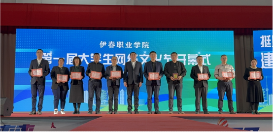 开幕式第二项由主持人公布伊春职业学院第一届大学生网络文化节评审团评委名单,结合赛事实际,评审团评委由各二级学院书记、院长、副书记、专业教师等11位成员组成,共同制定大赛评审规则,并由节杨为各位评委颁发聘书。
