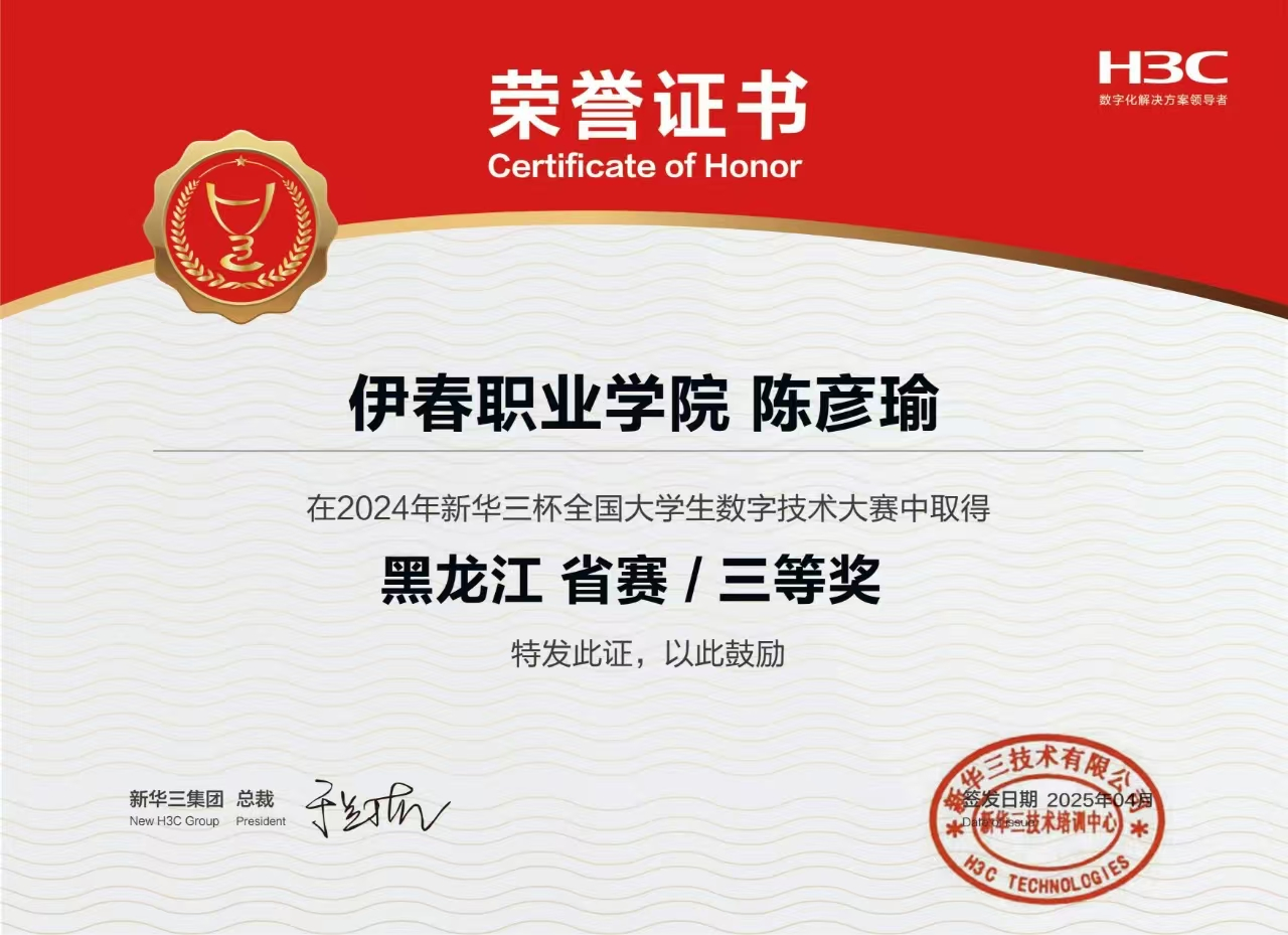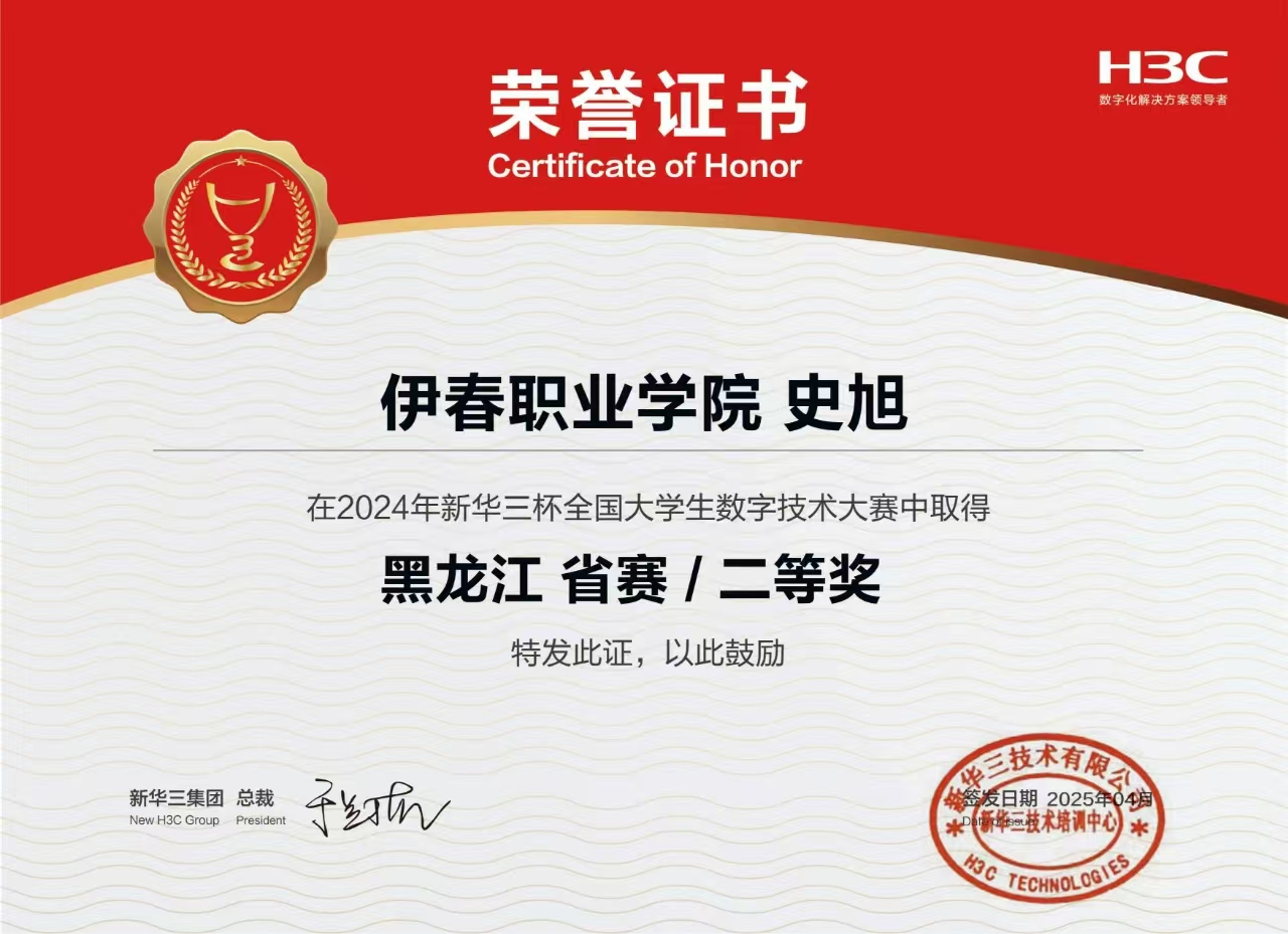 3月15日,2024-2025年第十四届“新华三杯”全国大学生数字技术大赛黑龙江赛区复赛圆满落幕。我院2023级计算机应用技术专业学生史旭、陈彦瑜在比赛中分别荣获二等奖、三等奖的好成绩。
