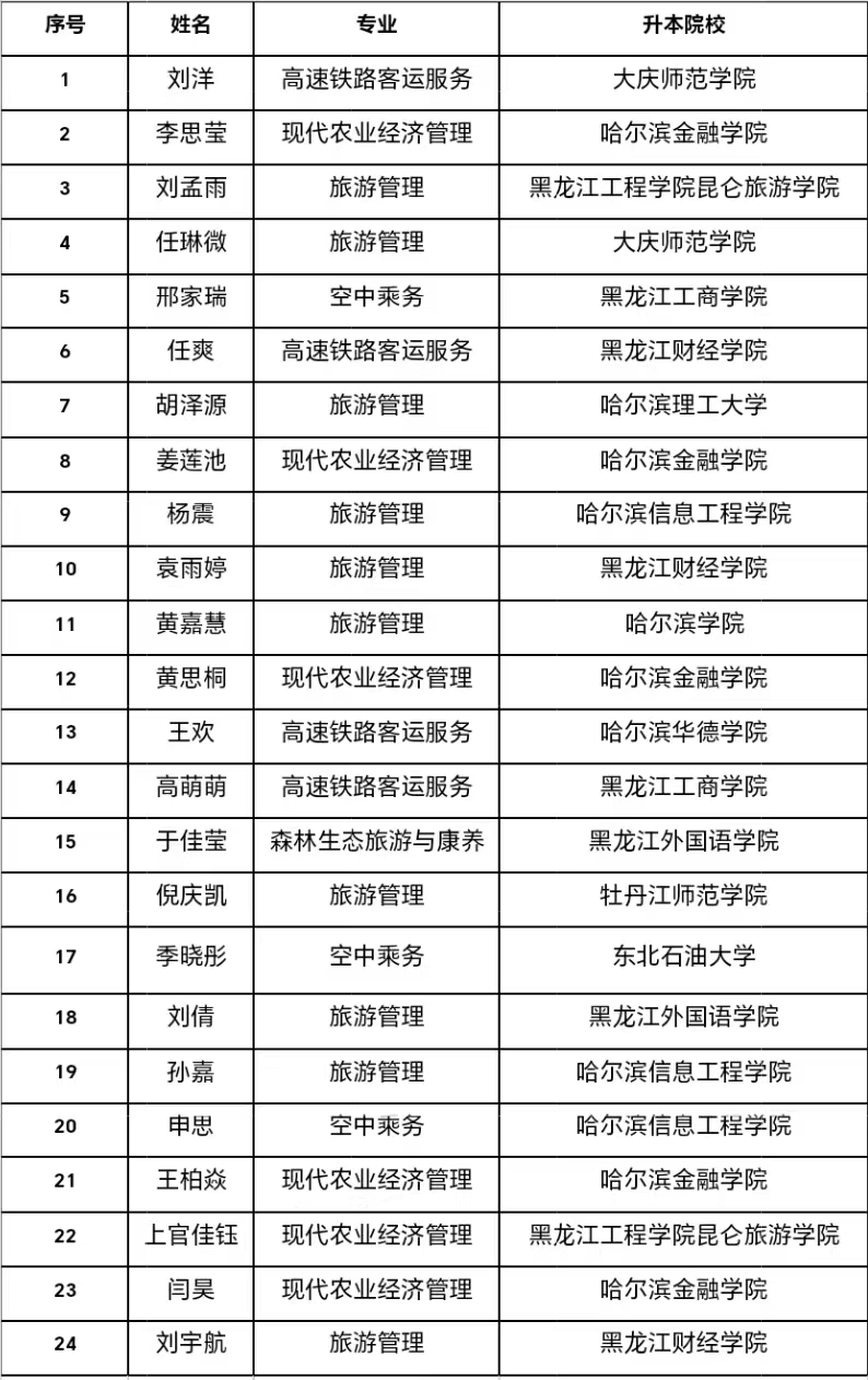 随着2025年专升本录取工作落下帷幕,我院2025届毕业生在升学赛道上全力冲刺,交出了一份亮眼的答卷!此次专升本考试中,我院共有24名学子凭借扎实的专业知识与不懈的努力,成功被哈尔滨理工大学、大庆师范学院等多所省内本科院校录取,这份优异的成绩,既是学子们数年如一日刻苦钻研的成果,也是学校坚持高质量教育、深化教学改革的有力体现!每一次挑灯夜战的坚持,每一回勤学苦练的执着,都化作了通往理想学府的阶梯。这些脱颖而出的优秀学子,用拼搏与汗水诠释了青春的力量,也为校园增添了荣耀与光彩!以下是旅游商务学院2025届专升本录取情况: