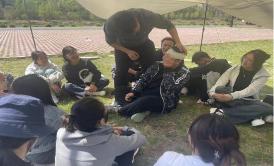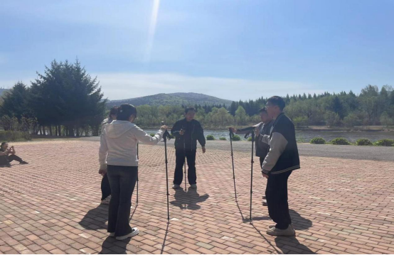 实训课上,王老师围绕课程本身从户外旅游行业发展实际情况出发,组织大家利用登山杖构建娱乐游戏“不倒森林”。