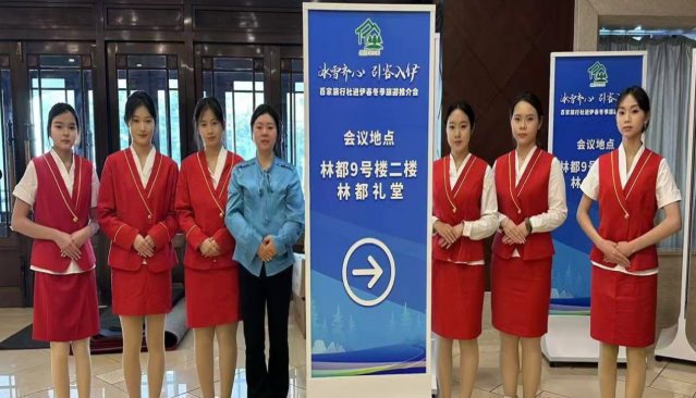 为了更好地服务本次推介会,旅游商务学院的志愿者们在赵莉莉、王宝才、姚方杰老师的指导下进行多次演练。会议服务中,她们凭借扎实专业的礼仪服务技能和饱满的工作热情得到了会议主办方和参会单位的好评。