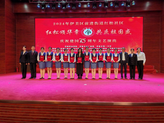 9月26日,伊春市伊美区前进街道红松社区举行了庆祝中华人民共和国成立75周年文艺演出。此次活动不仅是对新中国辉煌历程的深情回顾,也是对社区内杰出贡献者的表彰与致敬。伊春职业学院旅游商务学院积极服务地方发展,选派10名经验丰富、服务礼仪功底扎实的学生,在王廷、贾璇老师的带领下,为本次活动提供了全程礼仪服务。