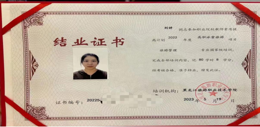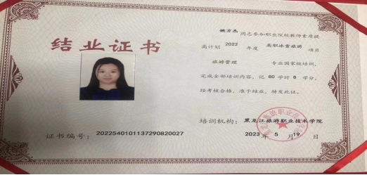 为响应习近平总书记提出的“冰天雪地也是金山银山”的号召,推动我校冰雪项目建设工作高站位、高品质、高水平发展。旅游商务学院重视教师素质提高,5月8日-19日,组织旅游专业姚方杰、刘婷两位教师参加“黑龙江高职冰雪旅游项目”培训学习。两位教师顺利完成并通过了培训学习,姚方杰老师被评为优秀学员。