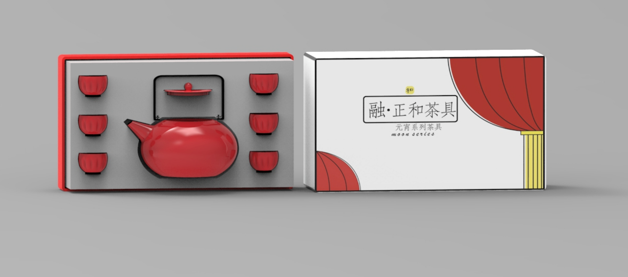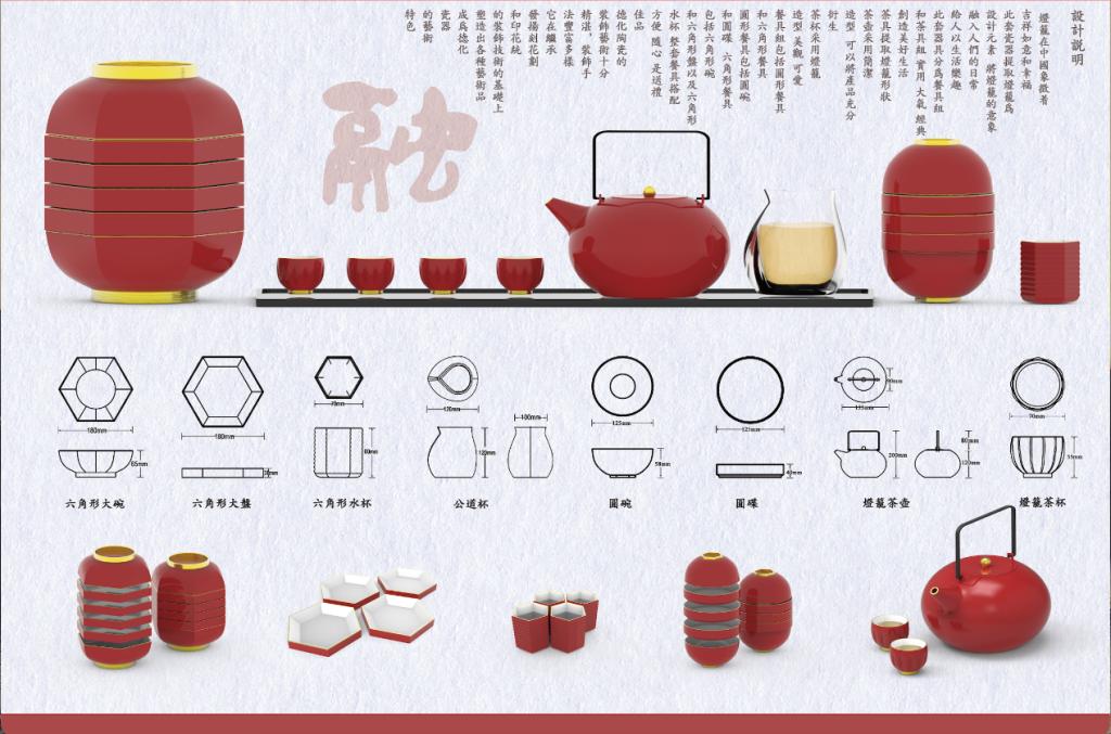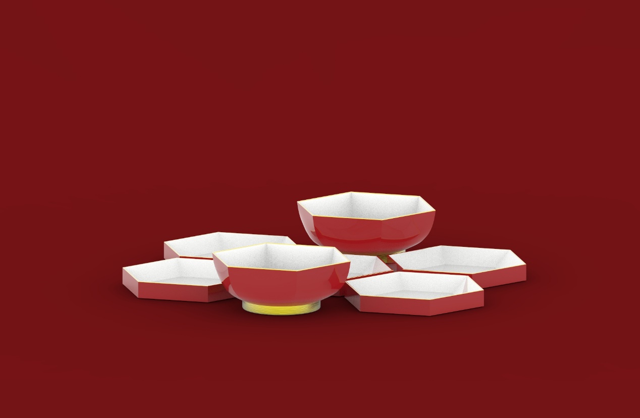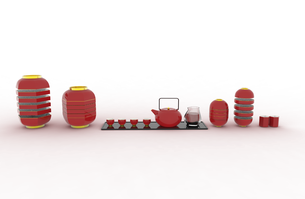 作品以“融”为核心,深挖传统灯笼团圆、喜庆的文化内涵,萃取其圆润轮廓、朱红主调等经典元素,融于餐具、茶具的功能与审美设计中。茶具复刻灯笼形态与分层结构,餐具打造圆、六角双形态系统,全系列模块化组合,兼顾实用与美学,让传统符号成为触手可及的日常美好。