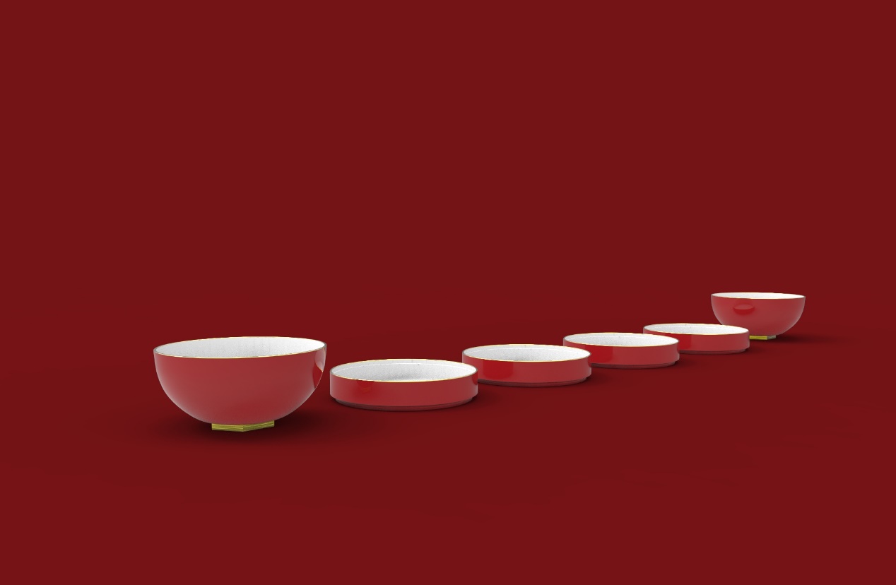 作品以陶瓷为载体,融合描金、刻花等传统与现代工艺,朱红釉面衬金色纹理,让每件器物既是日用良品,亦是承载文化底蕴的艺术佳品,践行了“学古不泥古、破法不悖法”的创作理念。将“团圆吉祥”的文化内核融入现代设计,实现了文化传承与实用功能的深度融合。