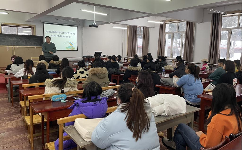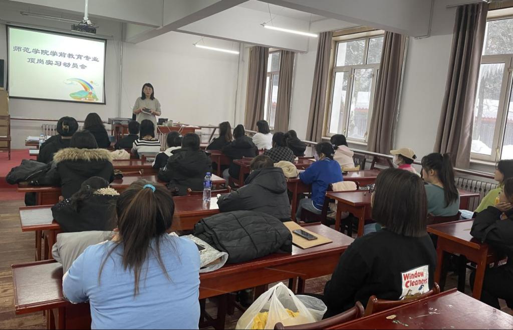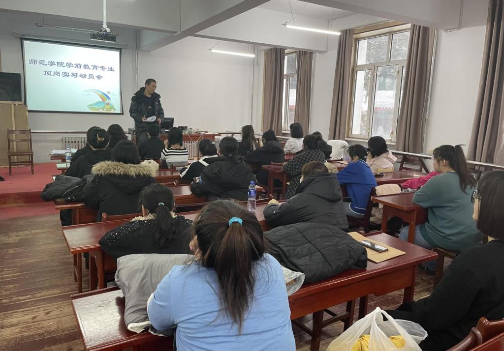 为做好2019级、2017级(五)学前教育专业顶岗实习工作,12月10日下午,师范学院在多媒体教室召开学前教育专业顶岗实习动员大会。院长王海峰、副书记张健、学前教研室主任王红及辅导员张丽娜出席了此次大会。即将奔赴北京、上海、深圳等地顶岗实习的71名学生参加了此次大会。