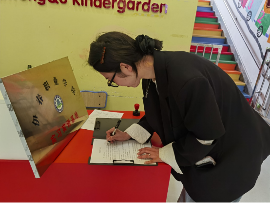 王海峰和企业负责人就企业用人需求、人才培养、课程改革、顶岗实习等方面进行了深入交流。接着,双方签订了合作协议并进行了授牌仪式,我院为冷婧园长颁发了行业导师聘书。