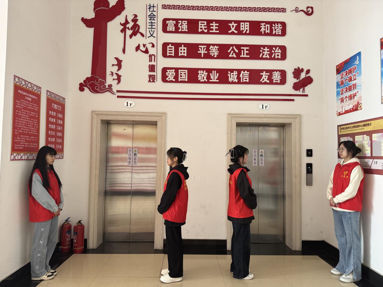 活动当日,志愿者们身着统一服装,提前抵达伊美区青少年活动中心,迅速投入岗位。在入口处,他们热情引导观众有序入场,协助主办方完成座位指引等工作;在舞台周边,志愿者们配合工作人员维持秩序,提醒观众遵守观演礼仪,确保启动仪式及文艺演出环节顺利进行。