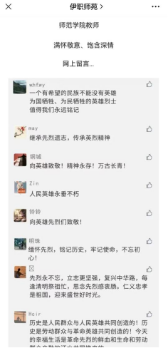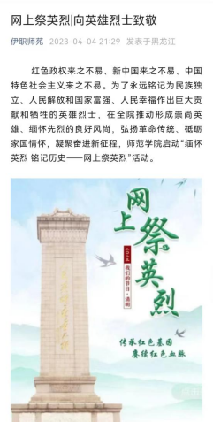清明时节,师范学院公众号伊职师苑推出了“清明祭英烈”线上缅怀活动,积极倡导网上祭扫。全院师生在网上向烈士献花、寄语留言,表达对革命先烈的深切缅怀和无限敬仰之情。