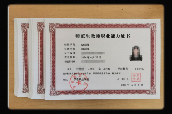 “百年大计,教育为本;教育大计,教师为本”。依据《关于做好2023届教育类研究生和师范生免试认定中小学教师资格改革工作的通知》,伊春职业学院2023年被教育部认定为师范生(幼儿园)免试认定高校之一(本年度学前教育专业黑龙江高职院校仅增5所免试高校)。按照省教育厅文件精神,根据师范生职业能力标准,我校严格制定了教育教学能力考核制度,通过培养过程性考核和师范生职业能力测试两方面过程性考核,以及思想品德情况及师德素养、教师教育课程学业成绩、普通话水平测试成绩、教育实习实践完成情况、专业能力及技能培训完成情况、笔试、面试等环节,各项考核合格的同学将被认定为我院免教资师范生。2023年6月6日,师范学院学前教育专业2020级三年制、2018级五年制共有113名同学通过考核,取得了由伊春职业学院王春海院长签发的《师范生教师职业能力合格证书》,考核通过率为89.0%。至此,本次学前教育学生教师资格免试认定工作圆满结束,通过考核的学生可凭借此证通过教育行政部门认定,获得教育部颁发的中华人民共和国教师资格证书。