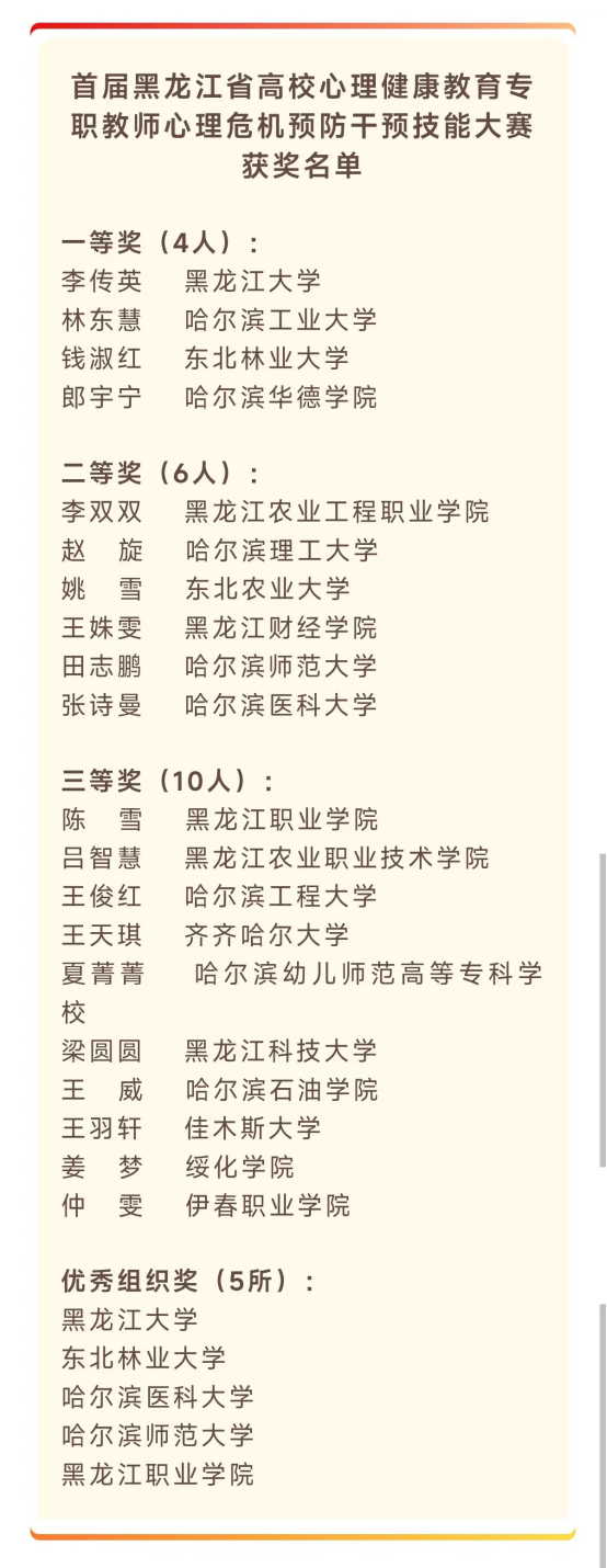 近日,由黑龙江省教育厅主办,黑龙江大学承办的首届黑龙江省高校心理健康教育专职教师心理危机预防干预技能大赛成功举办,来自全省本科和专科院校的60余名心理健康教育专职教师参赛,省教育厅思想政治教育处负责同志、全省78所高校心理健康教育专职教师代表共同观摩大赛。公共教学部心理健康教研室(心理健康教育中心)教师仲雯凭借出色的表现,荣获了本次大赛三等奖。