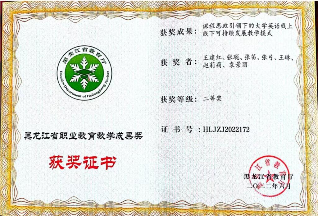由我部门教师王建红、张聪、张笛、王琳、袁景丽参与课题“课程思政引领下的大学英语线上线下可持续发展教学模式”获得黑龙江省教育厅“黑龙江省职业教育教学成果”二等奖。