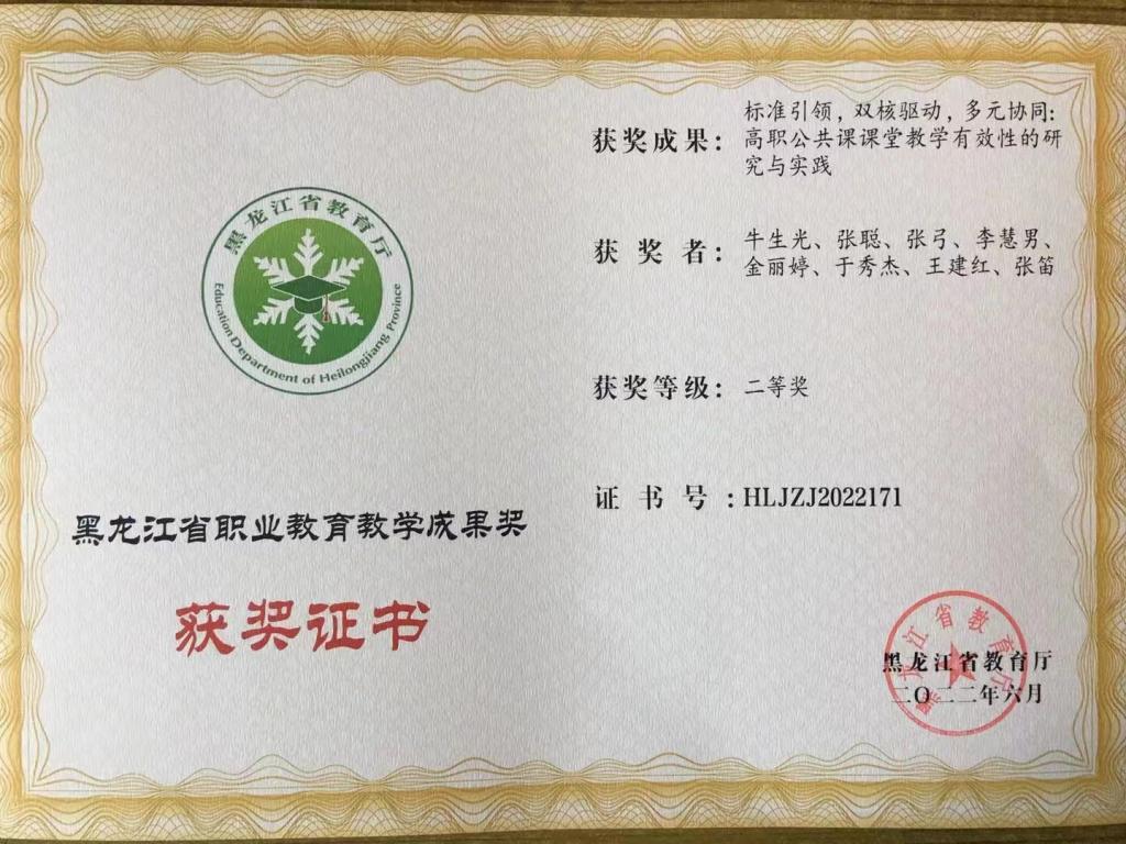 由我部门教师张聪、李慧男、金丽婷、王建红、张笛参与课题“标准引领,双核驱动,多元协同:高职公共课课堂教学有效性的研究与实践”获得黑龙江省教育厅“黑龙江省职业教育教学成果”二等奖。