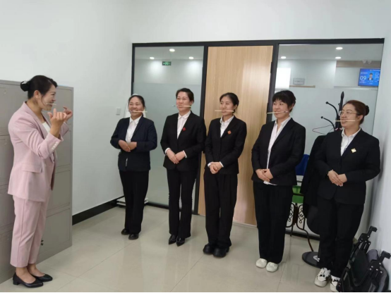 盘发实操后,汪雯雯老师就窗口服务工作中常用的手势礼仪、行进礼仪、引领礼仪等内容进行了培训。着重讲解了微笑服务礼仪在窗口工作的重要性,讲授了微笑的实操方法。各位工作人员都积极进行了配合,并认真进行了练习。