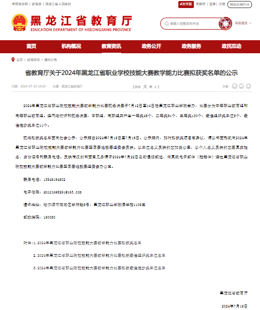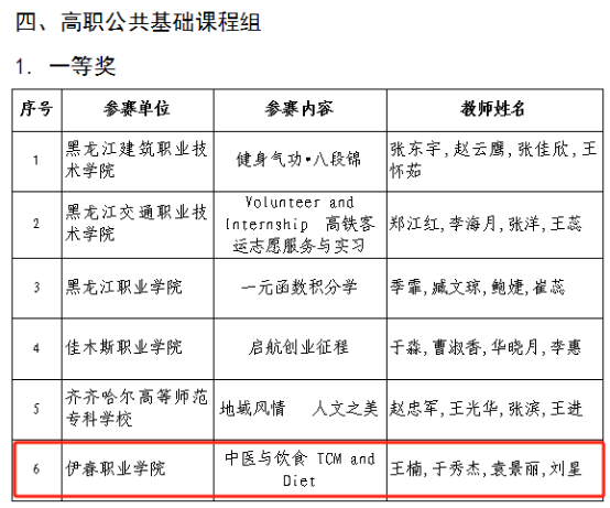 2024年黑龙江省职业院校技能大赛教学能力比赛现场决赛于7月12日至14日在黑龙江职业学院举办,比赛分为中等职业教育组和高等职业教育组。经网络初评和现场决赛,中职组、高职组共产生一等奖49个,二等奖91个,三等奖130个。公共教学部大学英语《中医与饮食 TCM and Diet》王楠、于秀杰、袁景丽、刘星教学团队荣获公共基础课程组一等奖,再创省级教学能力比赛新高。