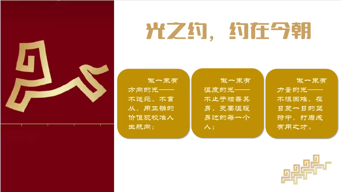 课程在“光之约”中发出青春号召:与自己约定,做有方向的光;与彼此约定,做有温度的光;与时代约定,做不负韶华的光。激励同学们以赛为标、苦练本领,勇攀技能高峰。