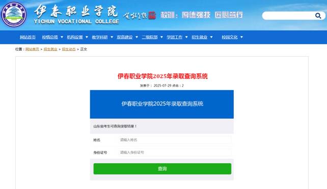 考生可登录“伊春职业学院官网”或关注“伊春职业学院招生就业公众号”,第一时间查询自己的录取情况。