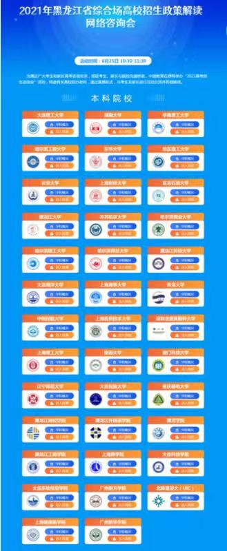 为贯彻落实《教育部关于做好2021年普通高校招生工作的通知》精神,做好高校考试招生宣传服务,使广大考生和家长能够更准确、更全面地了解高校今年的招生政策,以及搭建考生、家长与学校的沟通桥梁,中国教育在线特于6月25日举办“2021年黑龙江省综合场高校招生政策解读网络直播咨询会”公益活动。
