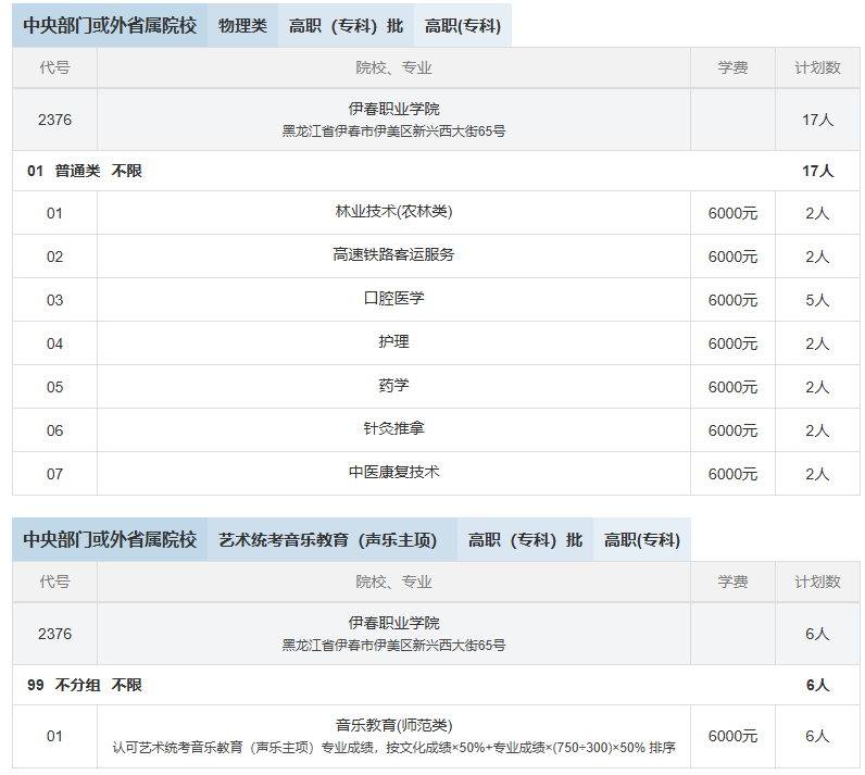 伊春职业学院2025年云南省招生计划