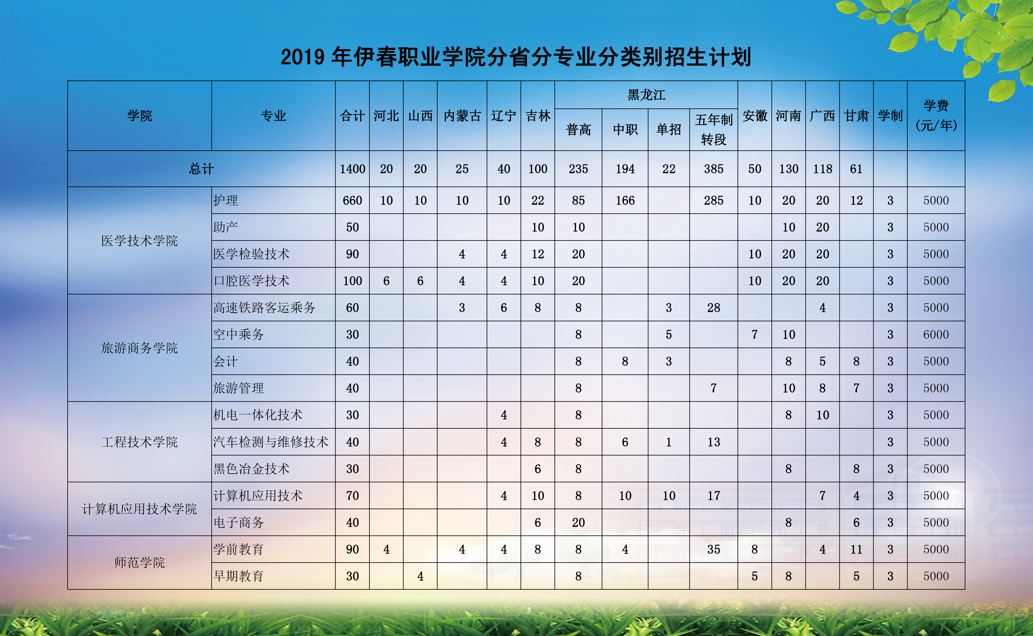 伊春职业学院2019年分省分专业分类别招生计划