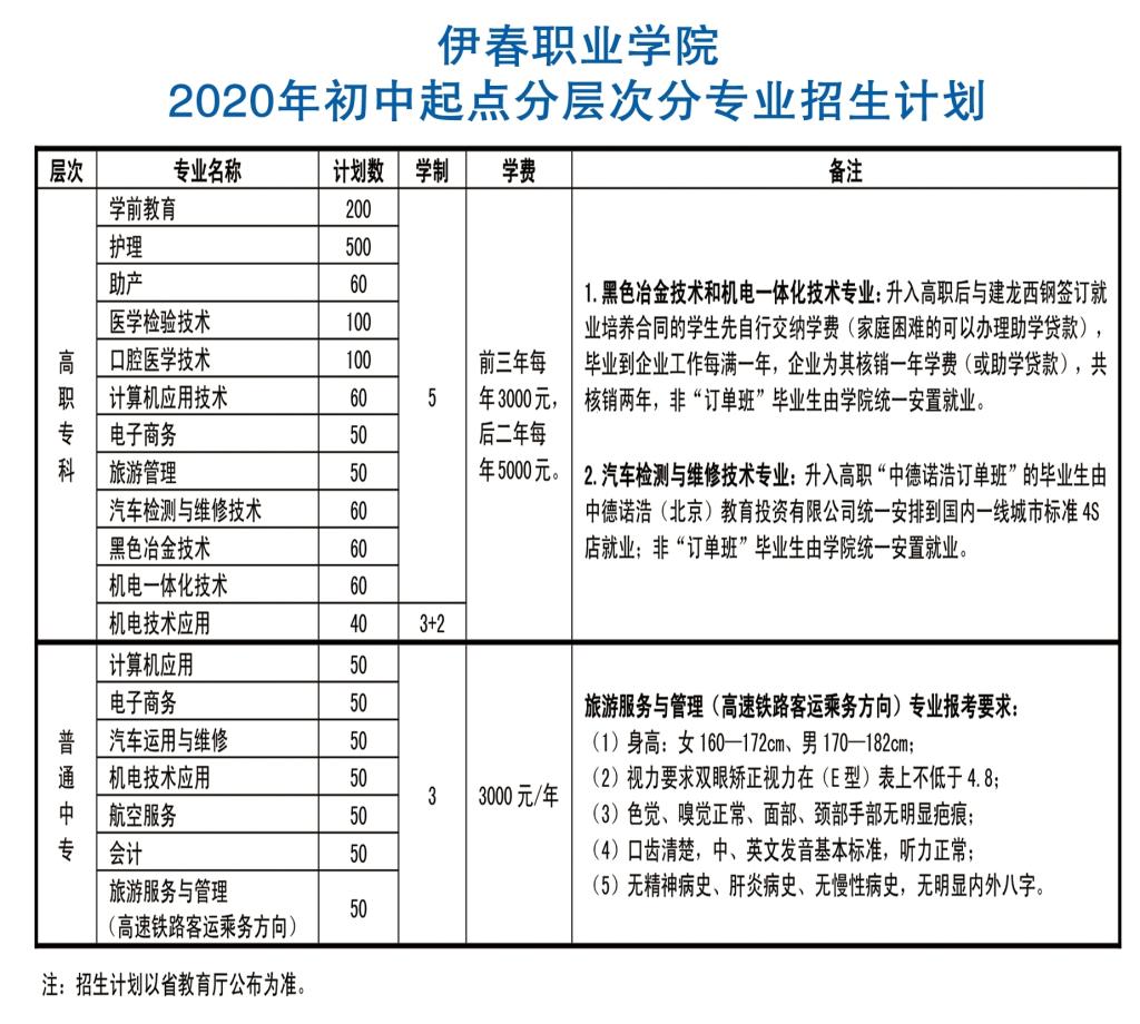 伊春职业学院2020年初中起点分层次分专业招生计划