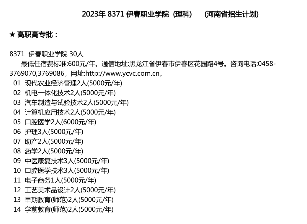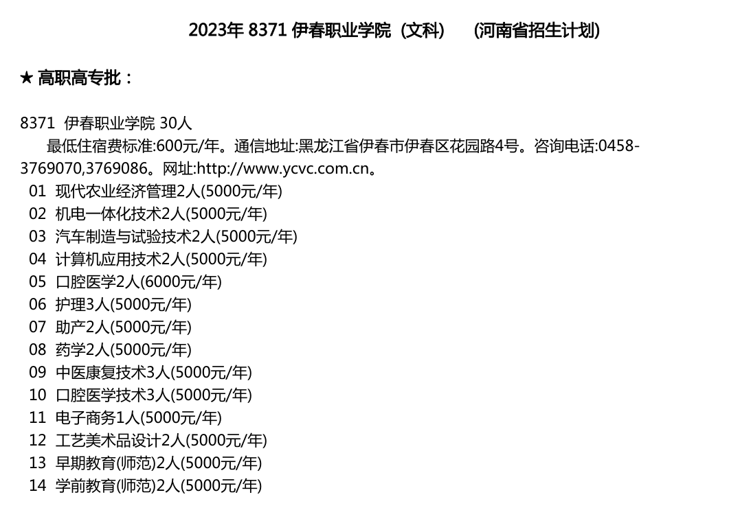 伊春职业学院2023年河南省招生计划