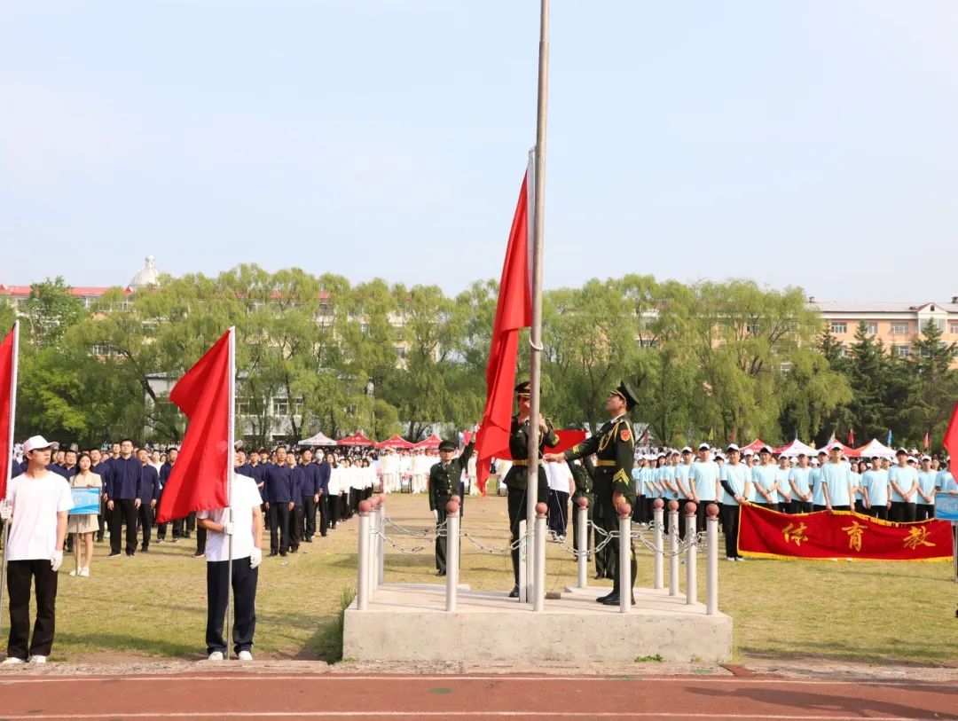 国歌声响起,在场师生全体肃立,向国旗行注目礼并齐声高唱国歌。