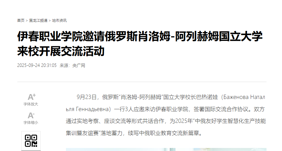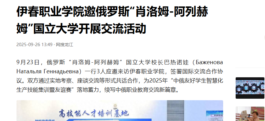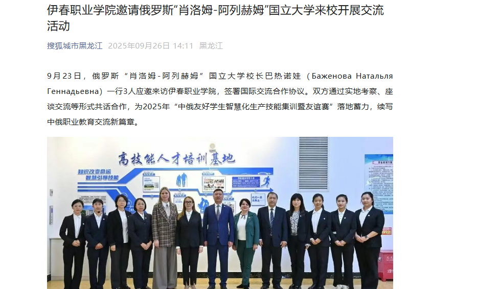 9月23日,俄罗斯“肖洛姆-阿列赫姆”国立大学校长巴热诺娃(Баженова Натальля Геннадьевна)一行3人应邀来访我院,签署国际交流合作协议。双方通过实地考察、座谈交流等形式共话合作,为2025年“中俄友好学生智慧化生产技能集训暨友谊赛”落地蓄力,续写中俄职业教育交流新篇章。