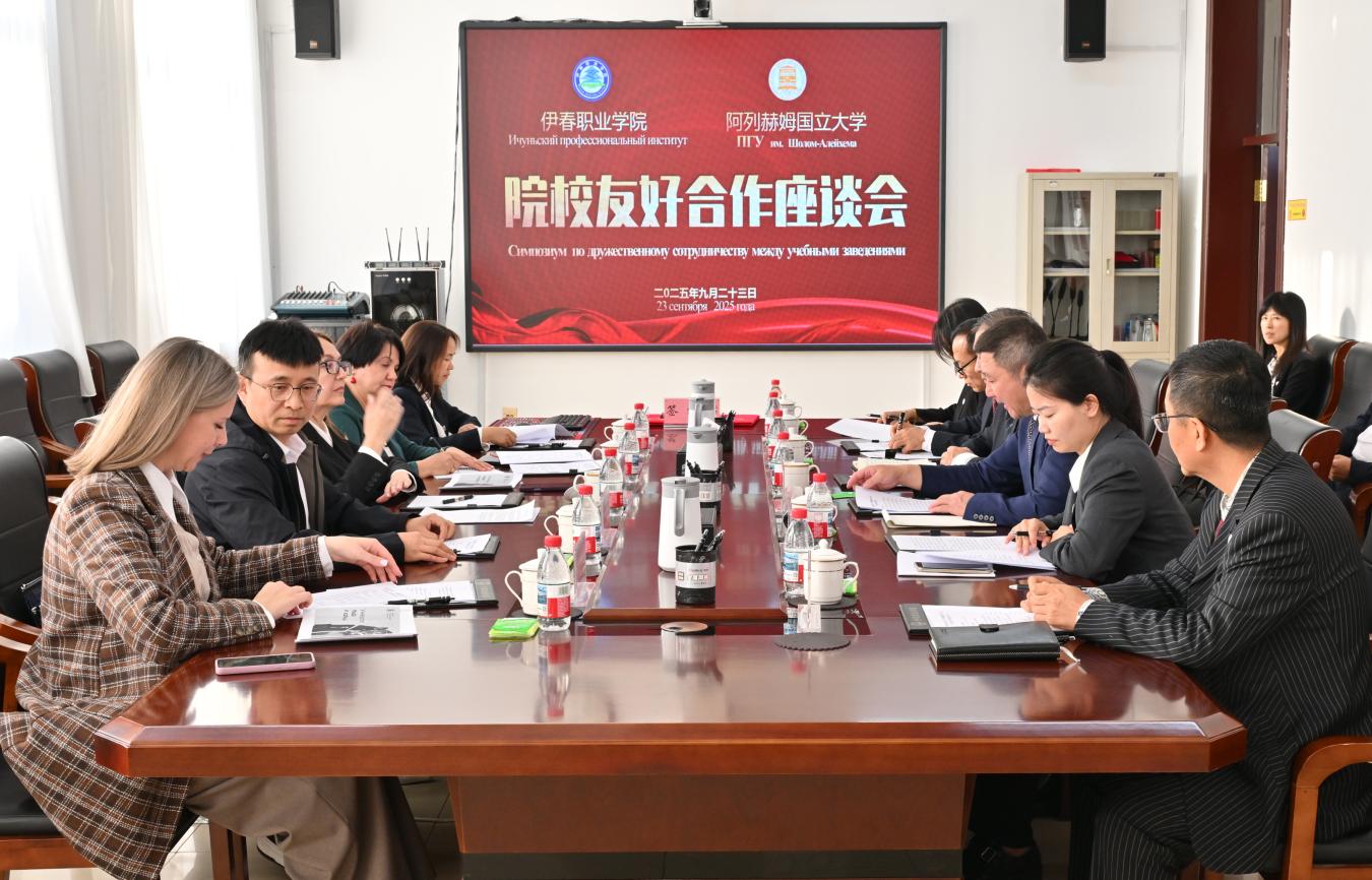 参观结束后,双方召开座谈交流会。座谈会上,王春海院长致欢迎辞,同时,介绍了学院的发展历程和特色优势。他表示,2025年是学院高质量发展迈入新阶段的关键之年,学院将秉持“办学能力高水平、产教融合高质量”的标准,持续推进“双高”建设。在这一重要时间节点上,与俄罗斯“肖洛姆-阿列赫姆”国立大学深入开展国际交流合作,对于学院拓宽全球化视野、推动国际化办学、响应国家“职教出海”战略,均具有极其重要的意义。巴热诺娃校长介绍了俄罗斯“肖洛姆-阿列赫姆”国立大学的发展历史、学科特色以及学校在国际教育合作方面的成果。她表示,“肖洛姆-阿列赫姆”国立大学高度重视与中国高校的合作,期望以此次交流为契机,进一步巩固和深化两校间的友好合作关系,共同培养和共享技能人才,实现优势互补、合作共赢。