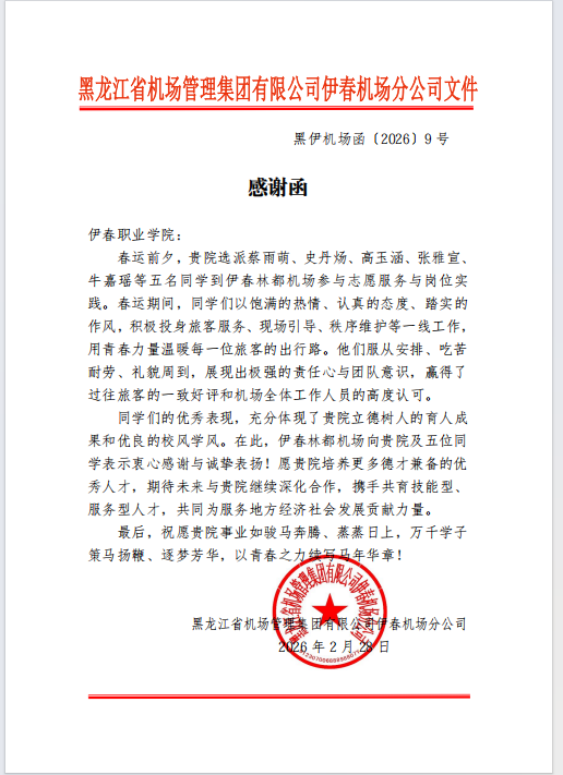 2月28日,伊春职业学院收到黑龙江省机场管理集团有限公司伊春机场分公司的感谢信,对我院选派的5名学子,在为期40余天春运期间的出色志愿服务表达了诚挚谢意。