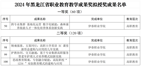 近日,黑龙江省教育厅发布了《关于2024年黑龙江省高等教育(本科、研究生)和职业教育教学成果奖拟授奖成果的公示》。经单位申报、专家评审、教学成果奖评审委员会审议,我校喜获职业教育教学成果一等奖1项,二等奖3项。其中,《跨专业集群 基地化运营 数字化赋能:森林康养旅游人才一体化培养体系创新实践》荣获一等奖;《思政教育铸魂,专创融合赋能:高院职校“1234”双创教育模式的建构与应用》《护教协同、交叉融通:基于专业集群高职服务型老年护理人才培养模式创新实践》《铸魂强基、五策同行:高职大学英语5C课堂新形态建构与应用的九年实践》荣获二等奖。