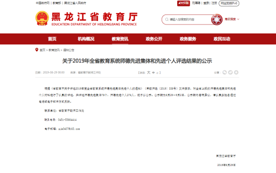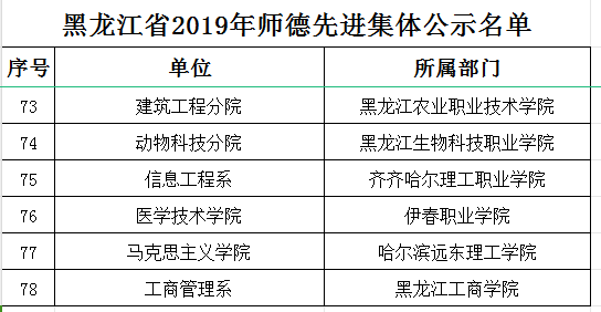8月29日,黑龙江省教育厅公布《关于2019年全省教育系统师德先进集体和先进个人评选结果的公示》《关于全省优秀教师和全省优秀教育工作者评选结果的公示》,全省共有共评选师德先进集体78个、师德先进个人276人、全省优秀教师769人,我校医学技术学院师德先进集体、韦立宏副教授获师德先进个人、于秀杰老师获全省优秀老师荣誉称号。